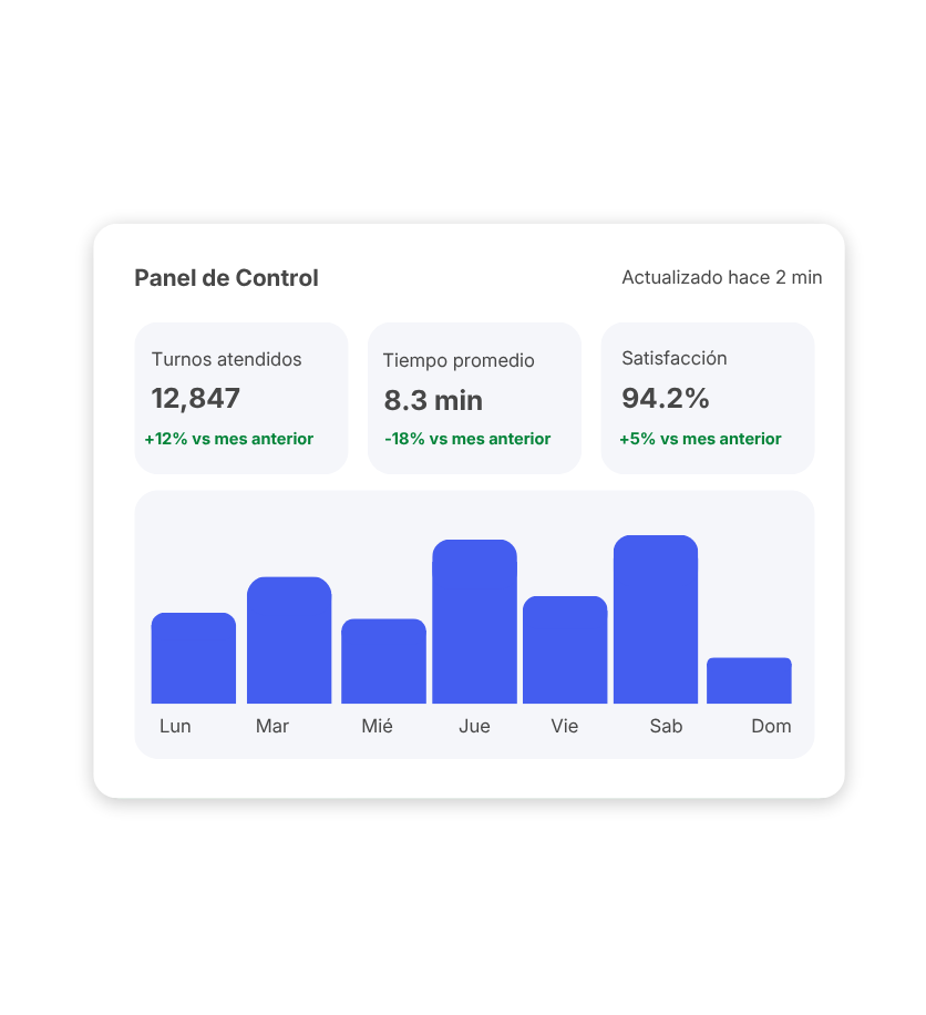Transforma la experiencia de espera con un sistema de turnos que va más allá del ticket. Permite tomar turnos desde múltiples canales, recibir notificaciones en tiempo real y optimizar la espera.