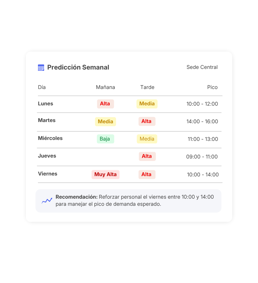 Anticipa picos de demanda con hasta 92% de precisión, identificando sedes de mayor afluencia y ajustando el personal según días y franjas horarias.